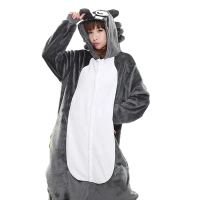 These full-sized, dark gray colored onesies sport a white underbelly where the button front closure is located. They come with convenient zip closure along the hips for when you want to go peepee in the middle of all those playful huffing and puffing about. Elastic cuffs hug the wrists and ankles, keeping you wonderfully warm especially during those cold winter days.