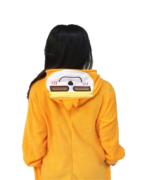 Feast your eyes on our Comical Orange Sloth Onesies that has so many features that will make it a worthwhile purchase. The sloth is a tree-loving mammal noted for its sluggish movements. These bright orange onesies have hoods that have the cute sleepy brown eyes of the sloth. The hood also features a black button nose and a smiley face. The hood also has orange drawstrings to help you adjust it to fit your head.