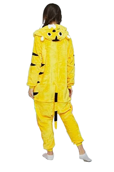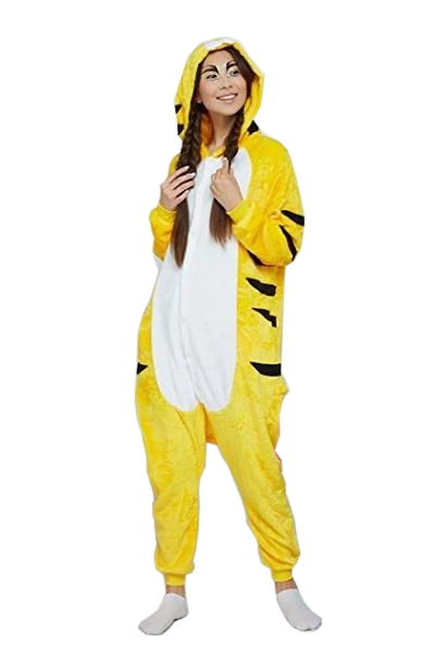 | Design and Style | Hood with cute tiger ears, Button front closure, Elastic cuffs, Side pockets, Horizontal back zipper at the hips, Cute tail, Black tiger stripes, White underbelly |