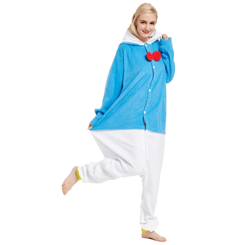 Feast your eyes on our Lovable Donald Duck Onesies for adults which will show your fascination for Disney when you wear them. These blue and white onesies have hoodies that have Donald Duck’s blue sailor hat with black lining and ribbon, black eyes, yellow beak, and white face. Our onesies also have a blue and white sailor shirt with a red ribbon bow. Also, this onesie has hoodie and white pants with yellow lining. This onesie also has a cute white tail to complete the Donald Duck look.