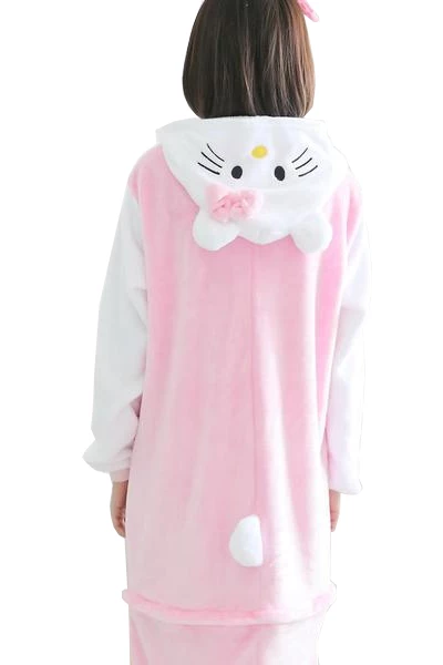 Reminisce your childhood days by wearing this Charming Hello Kitty Onesie. This will let your friends know that you adore Hello Kitty very much. This pink and white onesie has a hoodie that sports Hello Kitty’s pink ribbon, black round eyes, black whiskers, and yellow nose. This adorable onesie also has a white fuzzy tail at the back to complete the Hello Kitty look.
