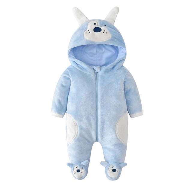 Who wouldn’t fall in love with the shaggy and comfy blue coat that surrounds the jumpsuit or the plush ears attached to the hood? The lightweight and baggy design are sized to fit most infants up to two years old. The fabric is primarily made of cotton which is perfect to keep your baby warm during nippy nights. This onesie is secured by a front zipper that runs all the way to the back for easy on and off and quick diaper change. A plush tail and stylish foot-covers complete the ensemble.