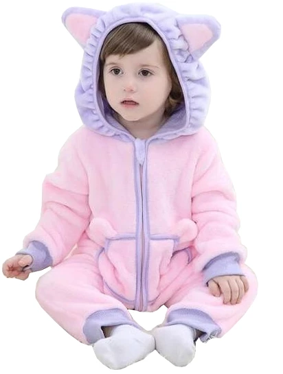 Dress your little one with our Cute Pink Baby Kitty Onesies and watch her have all the fun! These overalls are made from premium flannel so you are sure that this outfit will not only keep her warm during the cold nights but will also be very lightweight. We have added a zipper in the front to have easy access when it’s time to change diapers. The baggy design will also give your baby room to run around and have the best time anywhere she wears these. The elastic cuffs are also made to give you options as to the length of the sleeves that your baby is comfortable with. The outfit’s dainty pink hue will surely catch anyone’s attention and the lovely lilac details make the whole outfit pop out. With the hoodie featuring a very adorable kitty ears and face, your little princess will capture hearts everywhere she goes.