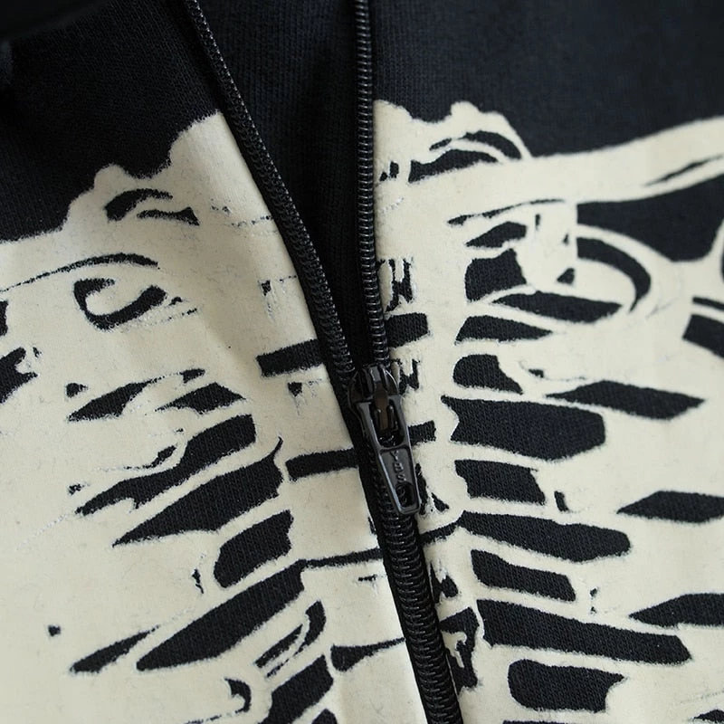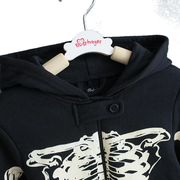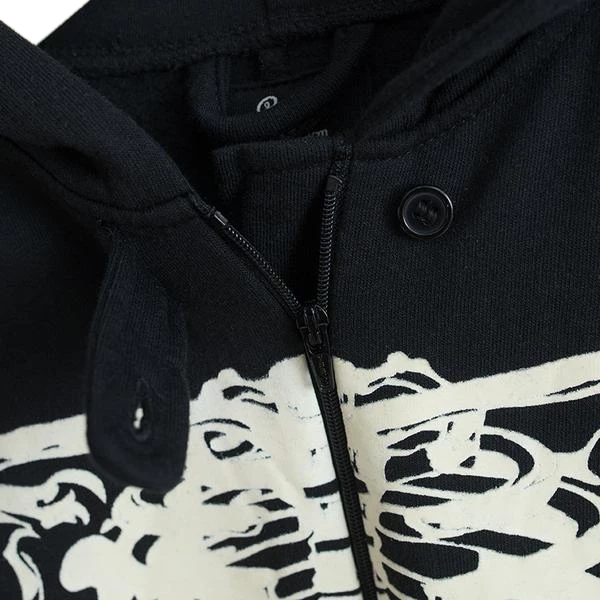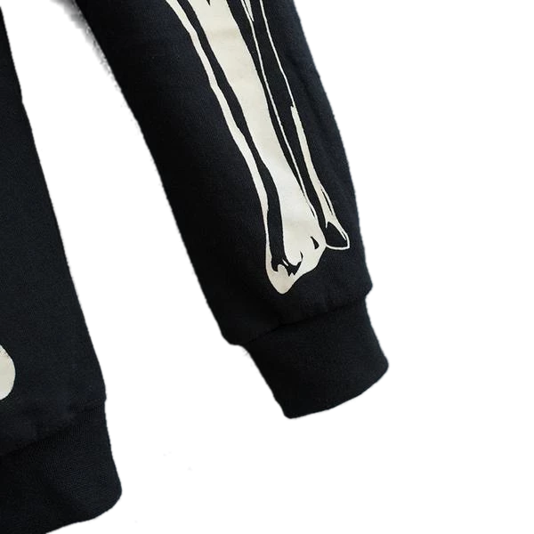 | Design and Style | Black hoodie with white skeleton print, front zipper with button enclosure, elastic cuffs |