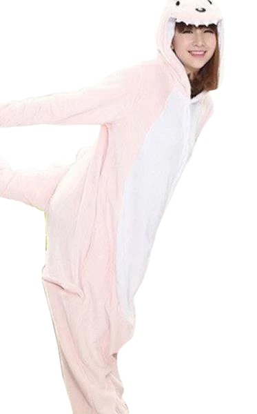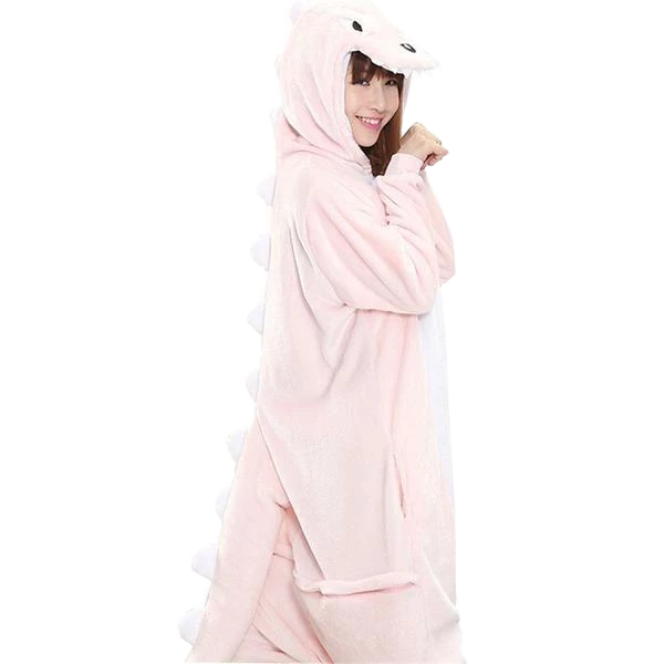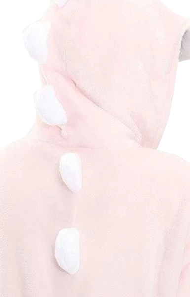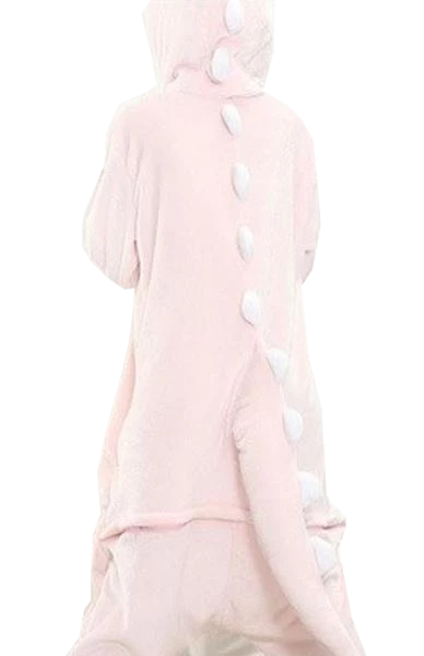 It’s definitely not a carnivore. This onesie comes styled as a hooded tunic. It has elastic ankle cuffs for both legs and a full sleeve with elastic wrist cuffs for each arm. In a stunning and sharp pink, it sports a white underbelly, a hoodie, and white spikes that run from the head to the tail. The fiberfill stuffed tail hangs a few inches below the costume for the perfect final touch.