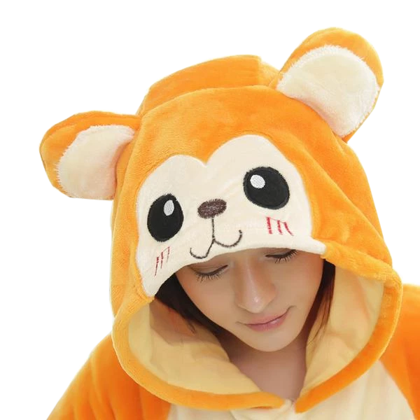 Feast your eyes on our Orange Monkey Onesies that will let others know that you love monkeys when you wear this onesie. These onesies have cute fuzzy ears, large black eyes, a small black nose, and rosy cheeks. This one-piece suit also has a long tail that moves when you walk to complete the monkey look.