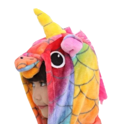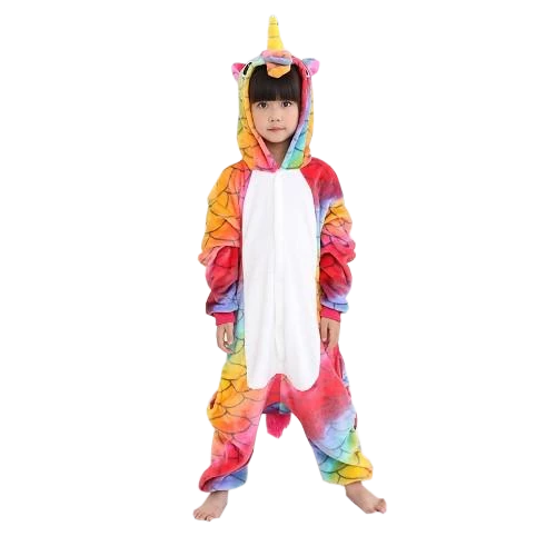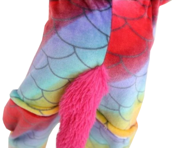 | Design and Style | Rainbow colored unicorn-style onesie with a hood, a button front closure, and elastic wrist and ankle cuffs |