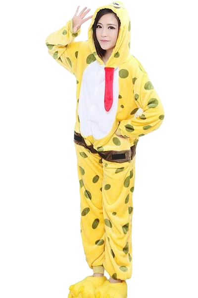Feast your eyes on our Adult Spongebob Onesies which has so many features to boast about. These yellow onesies have hoodies that have Spongebob’s big blue eyes, rosy cheeks, and his toothy smile. These onesies had Spongebob’s clothes consisting of his brown short pants, white chest, and his red necktie. This one-piece suit also has the sponge-like green spots strewn all over to complete the look.