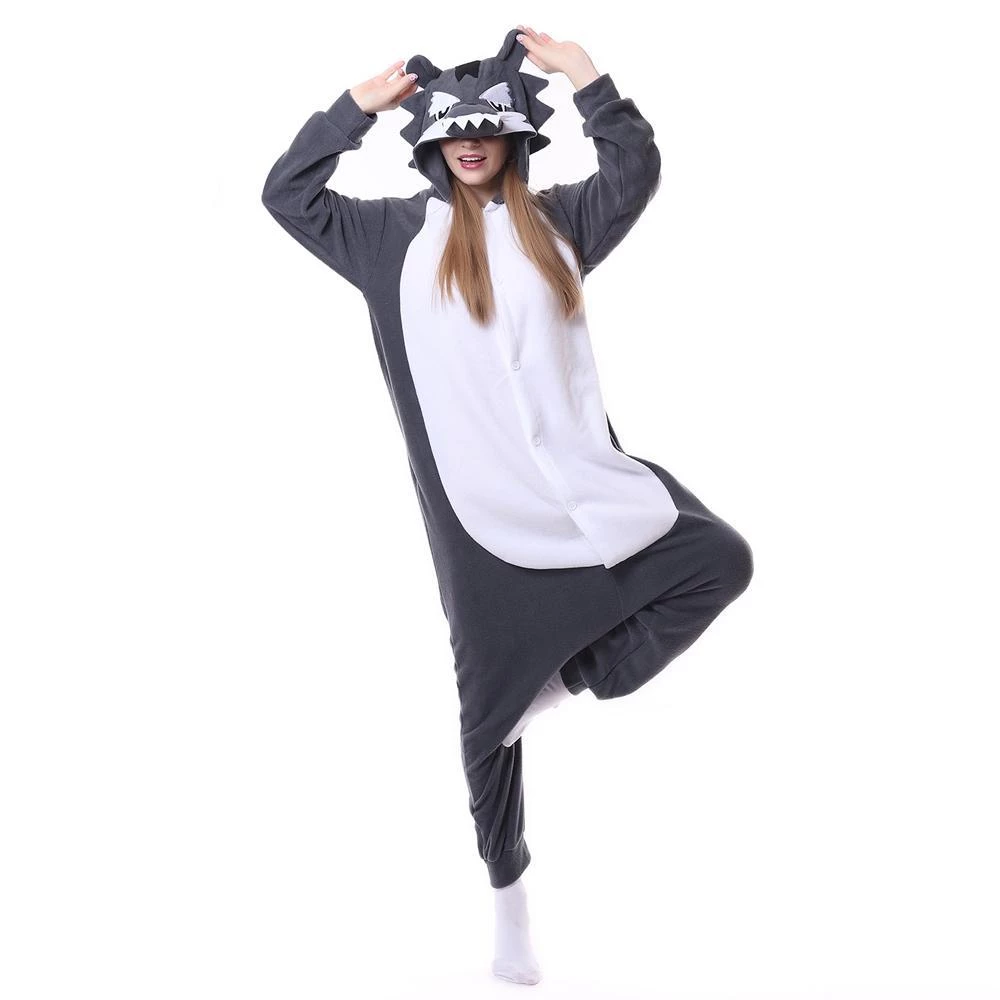 Featuring a one-piece design in baggy silhouette, these well -made jammies will keep you warm with their long sleeves and full-length pants. A non-detachable hoodie serves as the wolf’s head with its floppy ears, eyes, nose, and fangs. Plus, a medium length tail adorns the back for effect.
