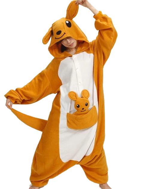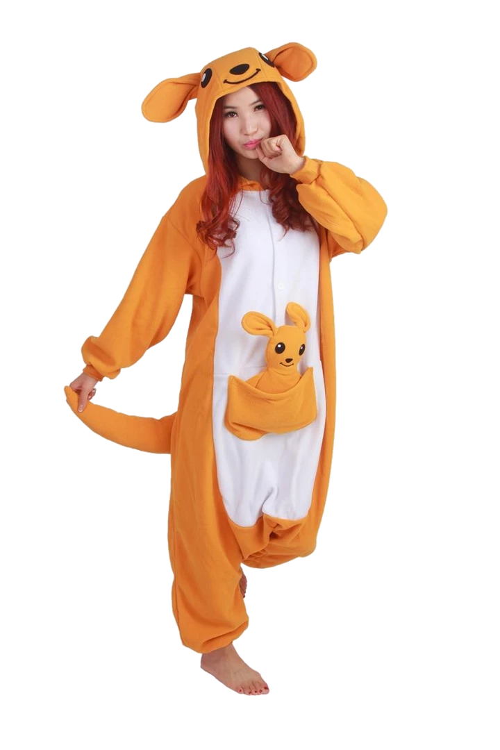 Our Joey The Kangaroo Onesies will keep you as warm as a young kangaroo wrapped in a nice flannel outfit. The long sleeves and baggy design of these overalls will make you ultra comfortable and able to move around and enjoy your party with friends. The front buttons will make it very easy for you to change clothes or give easy access when you need to go to the bathroom. This outfit also features elastic wrist and ankle cuffs to make you adjust how long you want the sleeves to go. The cutest hood features an adorable kangaroo mouth, nose, and ears and when you take a whirl around, you can show off the cutest little kangaroo tail! The front underbelly also features a cute little kangaroo baby being cradled inside. This little cutie will amaze everyone you meet!