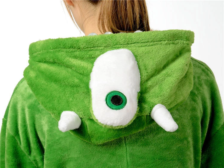 These loose fitting one piece designs feature long sleeves with elastic cuffs to hold them in place as well as long pants that go down to the ankles. Button front closure makes them easy to slip into while large side pockets located on each side of the hips are handy for keeping your fingers extra toasty. A non-detachable hoodie with a single monster eye and cute floppy horns will keep your head cocooned in softness so addicting you won’t ever want to take the whole thing off. Trust us, we’ve tried!