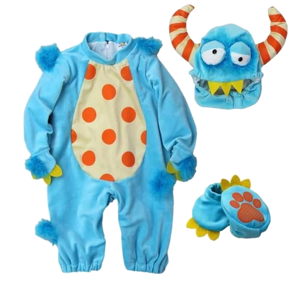 Our Cute Monster Onesies are light blue in color with a polka-dot underbelly. At the back of it, you’ll find a snap-on closure with a zipper that partially zips up to the back, which is strategically placed to prevent your child’s hands from getting injured. If your baby needs to go potty or in need of a quick diaper change, there’s no need to take off the whole thing; you can just unbutton the snap-on buttons at the bottom for quick and hassle-free access to their bum area. To really get the feel of being a monster, have your child slip on the foot paw shoes and the snap-on hoodie and see if they start to look scary or even more adorable!