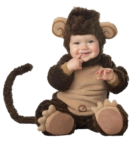 | Design and Style | Furry monkey inspired bodysuit with light-colored underbelly, long tail, legs snap-on button closure, back zipper closure, footies, elastic wrist cuffs, separate snap-on headdress with symmetrical features |