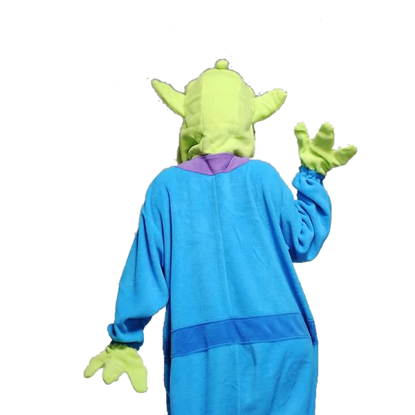 Represent all the toys and slay at every party when you wear our Toy Story Alien Onesie. It is made of high-quality polyester that guarantees a premium soft texture. Its top-notch design has a huge green hood with symmetrical features of a three-eyed alien with a pair of ears and a horn. This blue suit is complemented with violet fabric around the neck, a belt design and ankle cuffs in darker blue color. The embroidered planet Jupiter design on the chest is a declaration of your force to be the only alien dominating the dance floor during parties. Don’t forget to wave those humongous green hands up in the air or give everyone a high five.