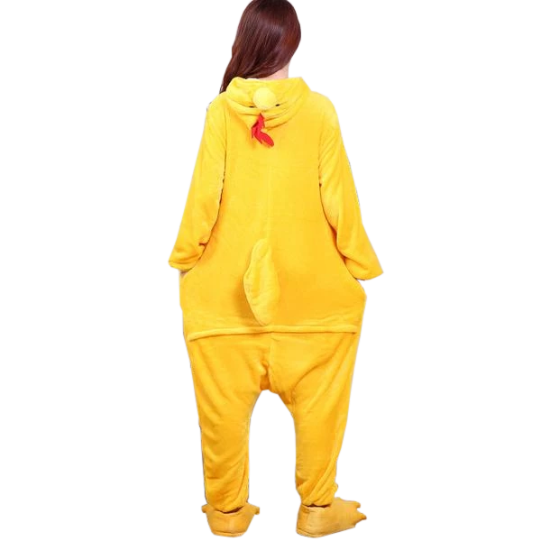 | Design and Style | Hood with red comb design, Button front closure, Elastic cuffs, Side pockets, Horizontal back zipper at the hips, Cute yellow tail, White underbelly. Kigurumi shoes not included |